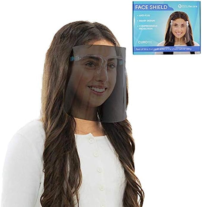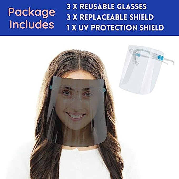 CUROfit Fully Transparent FACE and Eye Protection from Droplets and Saliva with Reusable 3 x Glasses & 3 x Replaceable Shield Aniti-Fog + 1 x UV Protection Sun Visor Shield